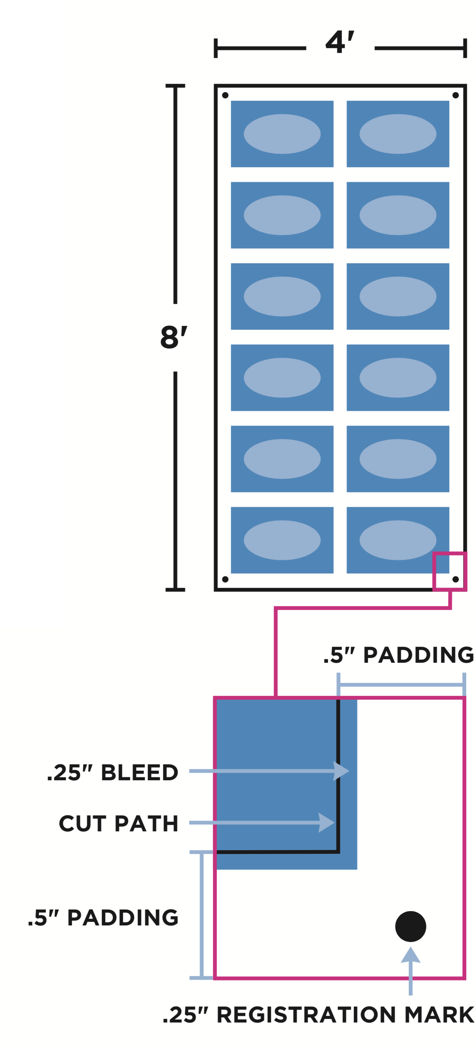 This border, or padding, reduces the amount of available print space on the material when a cut path is required. The default size from the edge of the cut path to the edge of the material is .5″.